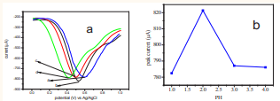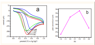 Optimization of the solution pH: The electrochemical behavior of ascorbic acid in buffered solutions has been studied at different pH values from 1 - 4 in cyclic voltammetry technique. The voltammogram is shown in Figure (3.2a ,b) and the plot of Ip vs PH is shown in Figure (3.2b)