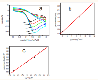 Effect of varying scan rate: The effect of scan rate (ν) on the cyclic voltammograms of ascorbic acid in phosphate buffer supporting electrolyte was studied (Figure 3.3a-c)