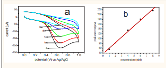 Effect of varying ascorbic acid concentrations: The cyclic voltammograms show that peak current increases linearly with increasing concentration of ascorbic acid from 1.0 to 8.0 mM as shown in Figure (3.4)