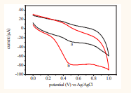 Figure 3.9: Cyclic voltammogram of (a) sample of coca cola and (b) a + 8 mL of 8 mM ascorbic acid standard at pH = 3 and scan rate of 100 mVs-1.