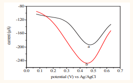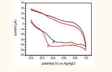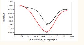 Cyclic voltammogram of (a) sample of Kemila and (b) a + 8 mL of 8 mM ascorbic acid standard at pH = 3 and scan rate of 100 mVs-1. Fig.3.6 Cyclic voltammogram of (a) sample of Gouder and (b) a + 8 mL of 8 mM ascorbic acid standard at pH = 3 and scan rate of 100 mVs-1.