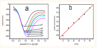 The correlation coefficient for the expression was 0.994. The peak current increased with the frequency due to the increase in the effective scan rate but the peak shape and baseline were distorted at frequencies higher than 60 Hz and therefore 60 Hz was selected as optimum frequency for further study. This was attributed to the greater contribution of the capacitive current at higher frequencies [36].