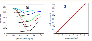 b) Calibration plot of peak current vs concentration under the optimized parameters.