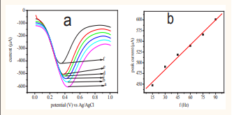 The peak current was found to be linearly proportional to the square root of scan rate as shown in Figure (3.3b) it can be given by equation 3.1 with its correlation coefficient of 0.998.
