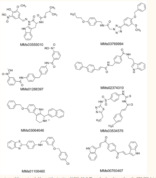 Virtual screening of the MMsINC database combined with molecular docking and MD simulations identified eight top hits that exposed the high-affinity binding to gp41 by targeting the MPER segment of this HIV-1 protein, allowing one to consider these molecules as promising peptidomimetic candidates of bNAb 10e8. Chemical structures of these compounds are shown in (Figure 1). Figure 2 casts light on the docked structures of the identified compounds