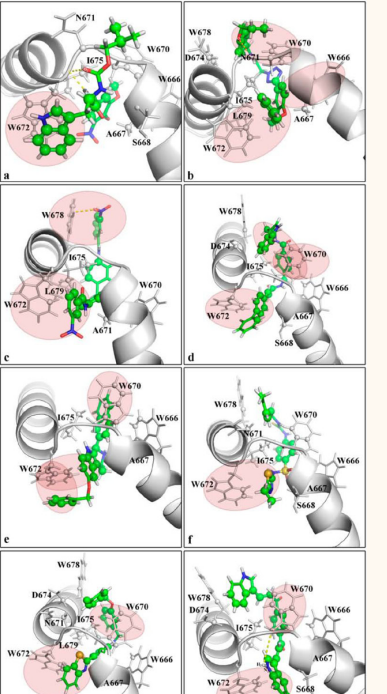 The data of molecular modeling show that eight chemical compounds from the MMsINC database (Figure 1) may be able to mimic pharmacophoric properties of bNAb 10e8 by specific and effective interactions with the MPER region of the HIV-1 protein gp41. Important role in the binding may belong to π-π interactions between aromatic rings of these molecules (Figure 1) and π-conjugated system of the gp41 residue Trp-672 (Figure 2) presenting one of the key epitope residues for 10e8 [10]. In a mechanism similar to that of bNAb 10e8, the identified compounds target the central hinge region of the MPER peptide (Figure 2) that provides a conformational flexibility necessary for its functioning in the cell-virus membrane fusion process [14].