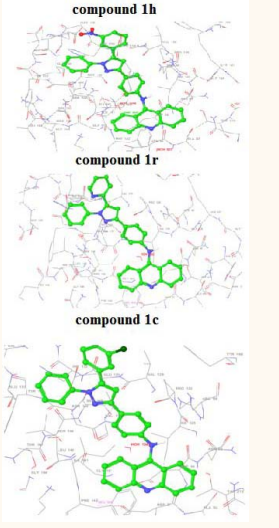 The best affinity modes of the docked compounds (1c, 1r, 1h) with Topoisomerase II with good Glide score are shown in Figure (2)