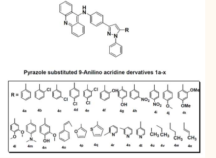 In the same context, acridines have various biological activities like antimicrobial [1], antioxidant [2], anticancer [3-5], antimalarial [6], analgesic [7], antileishmanial [8], antinociceptive [9], acetyl cholinesterase inhibitors [10] and antiherpes [11] etc. Amsacrine is the known compound of 9-anilinoacridines series, which was the first DNA-intercalating agent to be considered as Topoisomerase II inhibitor. Several detailed SAR studies of acridine-based DNA-intercalating agents suggest that, the mode of binding is important and the chromophore intercalate with DNA base pairs. The chemical modifications of 9-aminoacridines by the introduction of various substitutions were allowed expansion of research on the structure activity relationship to afford new insight into molecular interactions at the receptor level [12]. In fact, it is well established that slight structural modification on 9-anilinoacridines may bring various pharmacological effects. Similarly pyrazole derivatives are also reported for various biological activities [13,14] like antimicrobial, anticancer etc. In continuous of our previous research work [15-18], on searching new potent antimicrobial and cytotoxic agents, we have designed 9-anilinoacridine analogues bearing the N-Phenyl pyrazole residue on anilino rings for Topoisomerase II inhibition by molecular docking studies by using by using Schrodinger suite-2011 Maestro 9.2 version. The results revealed that the newly designed heterocyclic substituted 9-anilinoacridine analogues exhibited good inhibition with topo II. Generally the Topoisomerase II inhibitors exhibit antibacterial and cytotoxic activities.