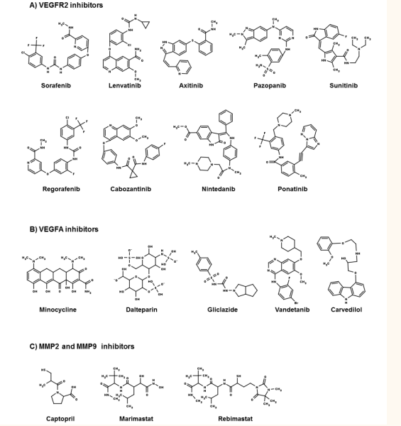 Figure 1: Three categories of FDA-approved angio-inhibitors obtained from PubChem compound database: A) VEGFR2 inhibitors – sorafenib, lenvatinib, axitinib, pazopanib, sunitinib, regorafenib, cabozantinib, nintedanib, and ponatinib; B) VEGFA inhibitors – minocycline, delteparin, gliclazide, vandetanib, and carvedilol; C) MM2 and MMP9 common inhibitors – captopril, marimastat, and rebimastat