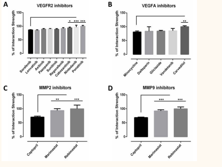 Figure 2: Interaction performance strength of angiogenesis inhibitors in percentage with + S.D.: A) cabozantinib, nintedanib, ponatinib have shown significantly high binding affinity, while lenvatinib, axitinib, pazopanib, sunitinib, regorafenib have shown relatively high binding affinity, with VEGFR2 when compared to sorafenib, and ponatinib; B) carvedilol has shown significantly high affinity, while dalteparin, gliclazide, vandetanib interaction was invariably similar, with VEGFA when compared to minocycline; C) rebimastat and marimastat have shown significantly high binding affinity with MMP2 when compared to captopril; D) rebimastat and marimastat have shown significantly high binding affinity with MMP9 when compared to captopril. *P < 0.05, **P < 0.01, and ***P < 0.001