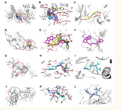 Figure 3: In silico docking of angio-inhibitors and target proteins (ABC = VEFGR2; DEF = VEGFA; GHI = MMP2; JKL = MMP9). The docking site is highlighted with a discontinued circle for all the targets (ADGJ). The top-scored ligands are displayed in the active site of the target protein (BEHK), and the top-ranked pose of the best ligand for each protein is depicted in its respective interacting pocket along with residues that are implicated in H-bonding (CFIL)