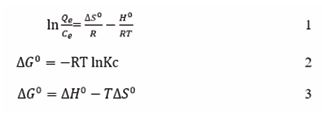 In Eq. (1), qe is the equilibrium adsorption capacity, Ce is the equilibrium adsorbate concentration ΔS0 is the standard entropy, R is the gas constant, ΔH0 is the standard enthalpy, and T is the absolute temperature. In Eq. (3), ΔG0 indicates the nature of the adsorption reaction. If the randomness (ΔS) of the dye adsorption increases, then the change in enthalpy (ΔH) indicates the nature of the reaction, such as whether it is an endothermic or exothermic reaction [50].