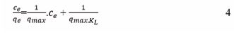 Where qe : equilibrium adsorption capacity, qmax : maximum adsorption capacity (mg/g), KL : Langmuir constant, Ce : equilibrium adsorbate concentration (mg/L). Further analysis of the Langmuir equation can be made using a dimensionless equilibrium parameter, also known as the separation factor, given by