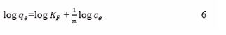Freundlich isotherm: The Freundlich adsorption model Eq. (6) is an empirical relation which indicates that adsorption takes place in multiple layers. The linear equation of Freundlich isothermal adsorption equation is as follows: