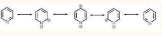 Pyridine has a conjugated system of six pi-electrons that are delocalized over the ring. The molecule is planar and thus, follows the Huckel criteria for aromatic systems. In contrast to benzene, the electron density is not evenly distributed over the ring, reflecting the negative inductive effects of the nitrogen atom. For this reason, pyridine has a dispose moment and weaker resonance stabilization than benzene (resonance energy 117 kgmol-1 in pyridine vs 150 kg mol-1 in benzene). The electron localization in pyridine is also reflected in the shorter C-N ring bond (137 pm for C-C bond in benzene), whereas, the carbon – carbon bonds in the pyridine ring have the same 139 pm lengths as in benzene. These bond lengths lie between the values for the single and double bonds and are typical for aromatic compounds [4].