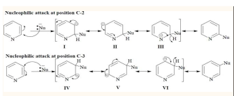As we have discussed in the electrophilic reaction that pyridine generally deactivated the aromatic ring towards electrophilic substitution reaction. The deactivation of the aromatic rings towards electrophilic substitution resulted due to the electron-withdrawing nature of the nitrogen atoms [6]. Due to such deactivation, Pyridine also gives nucleophilic substitution reaction. Nucleophilic substitution in pyridine ring occurs at position C-2. Approach of the nucleophilic at position C-2 leads to the formation of three resonating structures (I, II and III); similarly, the approach of nucleophilic at position C-3 also leads to the formation of three resonating structures (IV,V and VI). The resonating structures for intermediate resulting from the attack of the nucleophile at position C-2 are more stable than those of position C-3 since more electronegative nitrogen atoms hold a -ve charge in one of the resonating structures (III) obtained from the attack of the nucleophile at position C-2. Hence, the nucleophilic substitution in pyridine at position C-2 is always favored. (Figure 6 and 7).