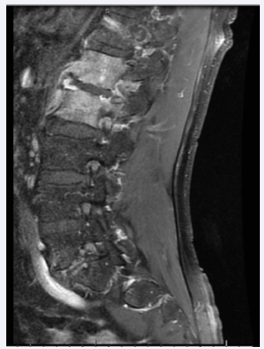Figure 1 Sagittal T1-weighted Contrast MRI of Lumbar Spine showing abnormal signal enhancement at L1 and L2.