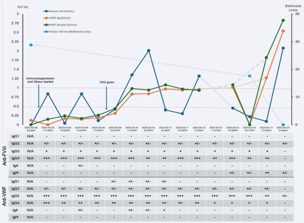 An urgent upper endoscopy revealed a small, non-bleeding gastric erosion, while colonoscopy identified numerous bleeding angioectasias that required argon plasma coagulation. Hematology was consulted for an isolated prolonged Activated Partial Thromboplastin Time (APTT) of 64 seconds (reference: 20-29 seconds). Testing confirmed a diagnosis of AHA, with FVIII activity <0.01 IU/mL (reference: 0.50-2.00 IU/mL) and a FVIII inhibitor level of 28.8 BU (reference: <0.6 BU). Unexpectedly, both VWF antigen (VWF:Ag) and VWF activity (VWF:GPIbM) were found to be low at 0.12 IU/mL (reference: 0.50- 2.00 IU/mL) and <0.15 IU/mL (reference: 0.48-1.73 IU/ mL), respectively. The VWF:GPIbM/VWF:Ag ratio was not calculable due to the VWF activity being below the detection limit. These results confirm the diagnosis of AHA along with von Willebrand Factor deficiency. With no personal or family history of a bleeding disorder, we considered the possibility of both AHA and AVWS. To manage the active bleeding, IV susoctocog alfa (Obizur®) was administered. An initial dose of 100U/kg IV resulted in a FVIII activity recovery to 0.84 IU/mL. However, due to the low levels of von Willebrand Factor, the estimated half-life of Obizur® was short, measuring approximately two hours. Given the absence of clear causes for AVWS on physical exam and investigations, we suspected immunemediated AVWS. Therefore, we administered Intravenous Immunoglobulins (IVIG) at a dose of 1g/kg and initiated oral cyclophosphamide and prednisone, each at 1mg/kg. Approximately 24 hours after IVIG administration, VWF testing showed rapid improvements in both VWF antigen and activity, suggesting a positive response to immunomodulation with IVIG (Figure 1). By 48 hours after the initial IVIG dose, VWF levels had normalized, which led to an improvement in the half-life of Obizur® to approximately 10 hours in the presence of endogenous VWF, which protects FVIII from premature clearance.