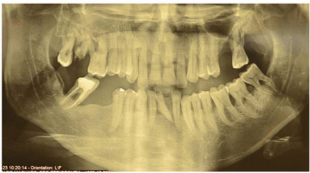 During the anamnesis, the patient did not report being a carrier of systemic diseases; declared him non-smoker. He reported regular tooth brushing three times a day with regular flossing and mouth washing. Asked about similar periodontal diseases in the family, he said he did not know. Radiographic examination revealed generalized vertical bone loss, being more localized in the molar and incisor regions. The diagnosis was aggressive periodontitis (Figure 3).