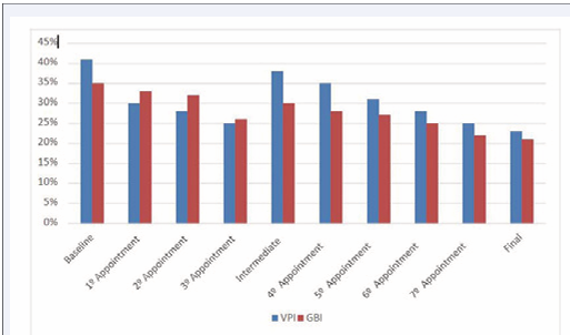 Figure 4 Percentage of VPI and GBI of the Supragingival Control between initial examination, intermediate examination and the final examination.