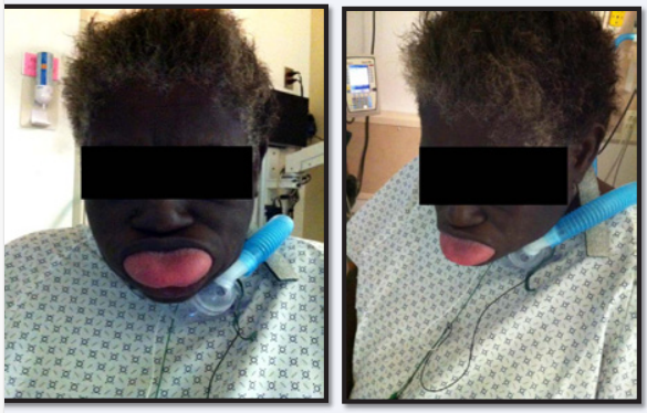 Our medical picture presents the case of an elderly female patient who was recently started on Lisinopril for management of hypertension. Her first dose resulted in mild swelling of tongue and lips. The swelling soon subsided and the patient did not take another dose over the next few days. This time the swelling of the tongue was worse than the previous episode. The patient still waited at home and did not seek medical attention. She took her third dose the following week which resulted in severe angioedema of the tongue and oropharynx. She was treated with epinephrine, antihistamine, steroids and owes her life to respiratory support through the tracheostomy tube especially in the initial phase of the episode. This can be seen in the medical pictures above.