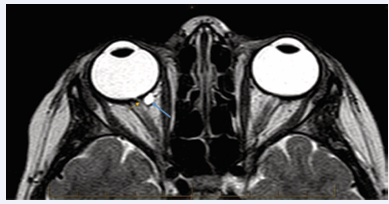 Figure 1 T2 axial image of the Right optic nerve pit, tubular extension (orange arrow) into a cystic structure which enhances with contrast (blue arrow).