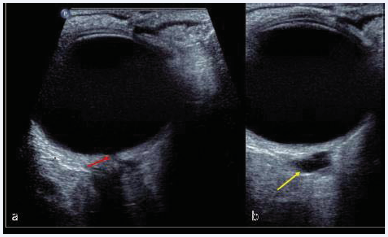 Figure 2 Ultrasound orbit. (a) ODP measuring 1.1mm and linear hypoechoic tract. (b) hypoechoic cyst.