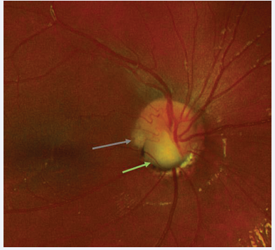 Figure 3 Colour fundus photograph demonstrating ODP on temporal aspect of disc (grey arrow) and coloboma inferiorly (green arrow).