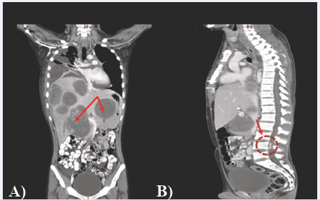 Figure 2 CT Scan chest, abdomen, pelvis with contrast a) coronal view: multiple hypodense lesions with specks of calcification in both lobes of liver (indicated by red arrow), b) sagittal view: the largest epidural component (2.3x1.1cm) along the L4 vertebra.