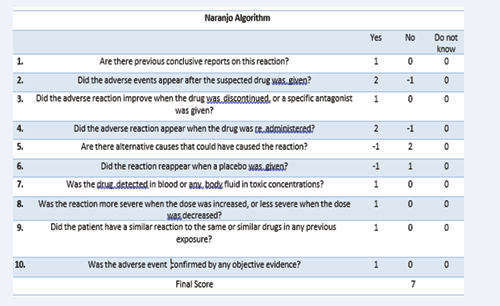 To identify causality associated with pharmacological interaction Naranjo algorithm was employed for the ADR report. It presented a score of 7, giving a result of probable ADR, as seen in Figure 1.