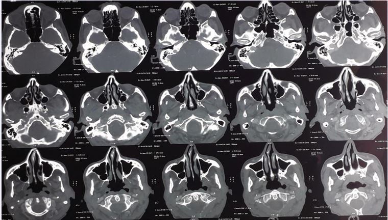 Due to the abnormal appearance of the nasal cavity, a sinus CT scan and a naso-rhino- cavoscopy with biopsy were performed (Figure 2).