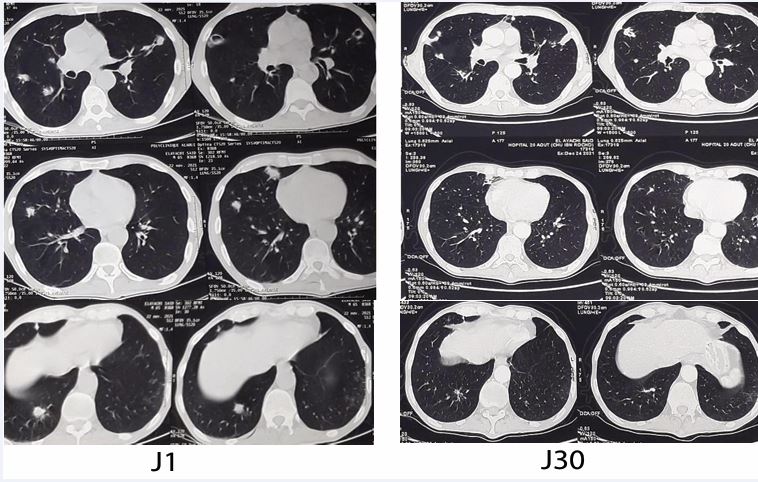 Figure 3 CT images showing regression of excavated nodules after one month of Voriconazole treatment.