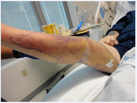 A 56 year old otherwise independent and functional man presented to our hospital after an episode of syncope associated with an expanding hematoma in his left leg. Over the previous three months, the patient had been experiencing recurrent episodes of spontaneous leg and thigh hematomas, which had been temporally associated with subsequent syncopal episodes. He adamantly denied any traumatic association with the hematomas. His legs had become increasingly edematous and ecchymotic, leading to significant impairment in his level of activity.