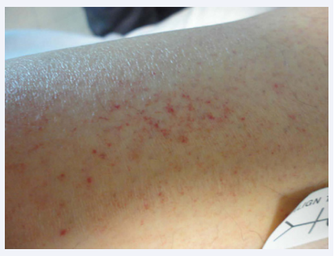 Figure 2 Perifollicular hemorrhages on the right lower extremity.