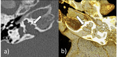 Figure 1: CT of the older brother at the age of 5 years. It shows bilateral cochlear incomplete partition type III. Both the right (a) and the left (b) cochlea lack the modiolus and the cribriform plate with preserved interscalar septa. This appearance has been referred to as “corkscrew” sign (arrows).