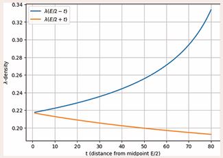 Within the lambda framework, we associate two density profiles with this decomposition. The first describes prime density on the left side of the midpoint, and the second describes prime density on the right side. Because lambda(x) is decreasing, the left density increases as t increases, while the right density decreases.