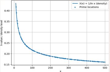 This function represents the local tendency of integers near x to be prime. It is positive, slowly varying, and strictly decreasing for sufficiently large x. These properties make it particularly well suited for symmetry-based analysis. The lambda function is not intended to predict the exact location of primes. Instead, it encodes the analytic structure governing their average distribution. In this sense, lambda(x) plays the role of a background field against which discrete primes appear as localized fluctuations. Similar density-based viewpoints are common in modern analytic number theory, especially in problems involving prime gaps, correlations, and short intervals [8,9].