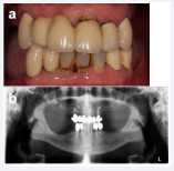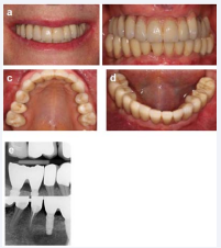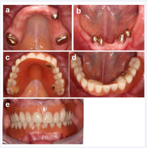 In 2014 the then 44 year-old female patients presented herself in our clinic with the wish to improve her intraoral situation. The general medical history was uneventful. The patient reported that she had gradually lost her teeth. According to her, most of her teeth were extracted due to caries, periodontal disease and invasive dentistry. She had received a complete prosthetic rehabilitation with removable dentures 13 years ago (Figure 1 and Figure 2a-e).