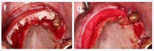 Figure 5: Augmentation operation with (a) creating access to the residual bone in the upper jaw using a full flap, (b) and (c) Sinuslift procedures on both sides, (d) and (e) inserting the xenogenic porcine bone grafting material, (f) augmenting the upper jaw buccally using xenogenic bone of bovine origin and (g) and membranes to cover the bone.