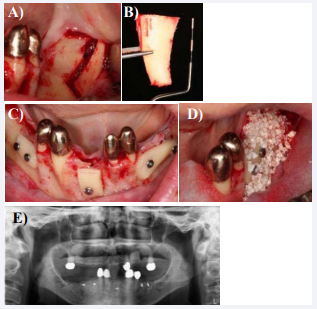 Figure 6: Augmentation operation in the lower jaw using a full flap and (a) and (b) bone grafts from both lineae obliquae (external oblique ridge), (c) fixed with titanium screws on the residual bone and (d) cover the bone blocks with xenogenic bone grafting material of bovine origin and membranes.
