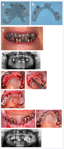Five month after the augmentation an implant drilling template originating from the set-up was produced (Figure. 7a and Figure 7b), checked intra-orally in habitual occlusion (Figure 7c) and used to re-calculate the length of the implants to be placed with an X-ray (Figure 7d). Afterwards the implants in the upper and lower jaw were placed sub-crestally using a full thickness flap (Figure 7 e-i).