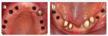 Figure 8: Four month after the implant placement impressions were taken. The soft tissue around the implants presented themselves without any signs of inflammation (a) in the upper jaw and (b) in the lower jaw.