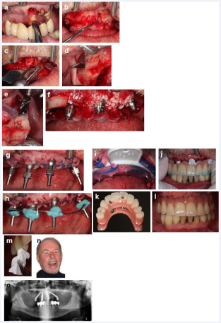 Figure 12: (a) Removing the residual dentition in the upper jaw, (b) the inflammatory tissue thoroughly, (c) levelling the residual bone by around 2-4 mms, (d) lifting the sinus on the right side, (e) sequentially drilling for the implant cavities, (f) covering the sockets and sharp edges with xenogenic bone grafting material, (g) closing the wound and place impression copings, (h) place a composite reinforced wire to improve rigidity, (i) take the impression and (j) the bite. (k) The temporary abutments were incorporated in the denture, and were then (l) placed onto the implants and (m) the screw accesses are covered with Teflon. (n) The patient after three days with a slight swelling evident. (o) The X-ray checking the implant positions.