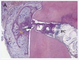 Figure 1: The lumen of radicular cyst opens into the apical canal. There is extensive epithelial proliferation of cyst epithelial lining infiltrated by many inflammatory cells. RC, root canal; Ep, epithelium (hematoxylin-eosin stain, original magnification x25). From Lin et al. J Endod 2009; 35: 607-615.
