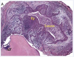 Figure 2: A cavity is completely enclosed by epithelium and separated from the root apex. The lumen of radicular cyst does not open into the apical root canal. There is also extensive proliferation of cyst epithelial lining infiltrated by many inflammatory cells. AF, apical foramen; Ep, epithelium (hematoxylin-eosin stain, original magnfication x25). From Lin et al., 2009; 35: 607-615.