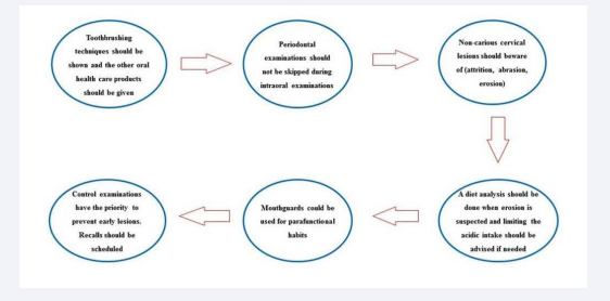 The most important procedure for overcoming sufferers’existing pain is to eliminate the etiological factors. There are numerous treatment options for hypersensitivity, and the majority of them have been found to heal this condition [3]. It is therefore essential to use the most appropriate treatment option for the specific underlying cause. Before pain and severe lesions develop, there are several preventive strategies available for consideration by dentists. A reduction in the risk of etiological factors is the main goal of preventive management. These procedures (Figure 1) focus on to prevent the exposure of the opened tubules to the oral environment and basically aim to prevent the formation of the cervical lesions.