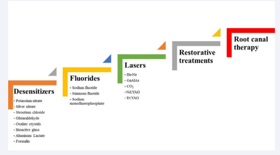 There are many treatment options for eliminating the pain. Several previous studies [15-17] have evaluated the efficiency of the most common methods used. Among the numerous treatment options, the most frequently used are nerve desensitization, covering or plugging of the tubules or a combination of both [10]. The most recently developed materials used in experiments are discussed below; a combination of these methods is generally recommended. In order to relieve the pain, restorative treatments may be applied, and root canal therapy is a last resort (Figure 2).