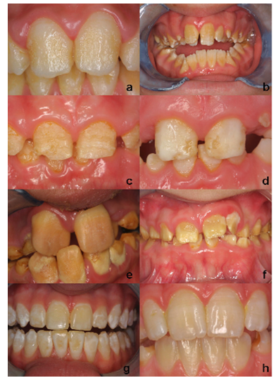 Figure 1: Dental fluorosis. (a) Mild fluorosis with slight accentuation of the perikymata, (b) moderate fluorosis, showing a white opaque appearance, (c) moderate, white opaque enamel with some discoloration and pitting, (d) severe fluorosis