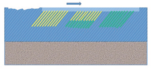 Figure 8: Fluoride apatite reaction (in blue HaP crystal, F- in black: fluoride ions are adsorbed onto the crystal)