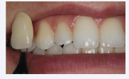 After the second application of the bleaching gel, it could be observed a satisfactory whitening of the teeth, where before the bleaching treatment the patient’s color shade was matched as B2 (Figure 5-a) and right after the bleaching procedure it was whitened to the BL3 color shade (Figure 5-b).